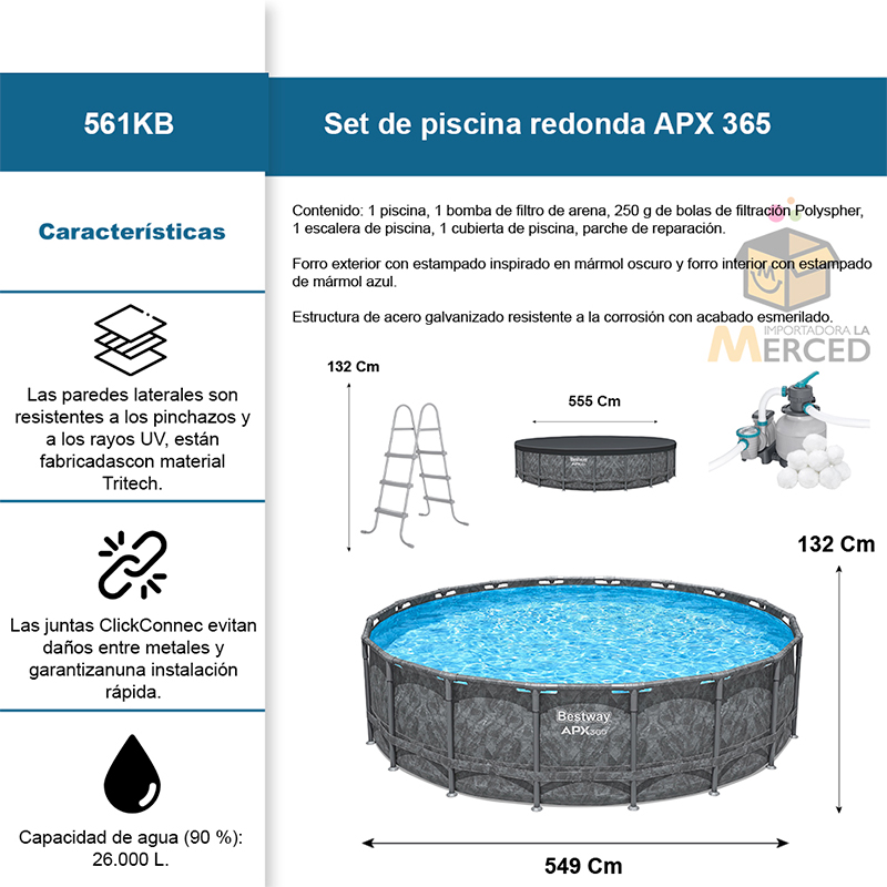 Ideal para reuniones familiares o fiestas en el jardín, esta alberca proporciona horas de diversión y es perfecta para combatir el calor. La Alberca Redonda Familiar Bestway APX 365 es sinónimo de confort, diversión y calidad para disfrutar de un verano inolvidable. ¡Prepárate para vivir momentos de diversión acuática junto a tus seres queridos!