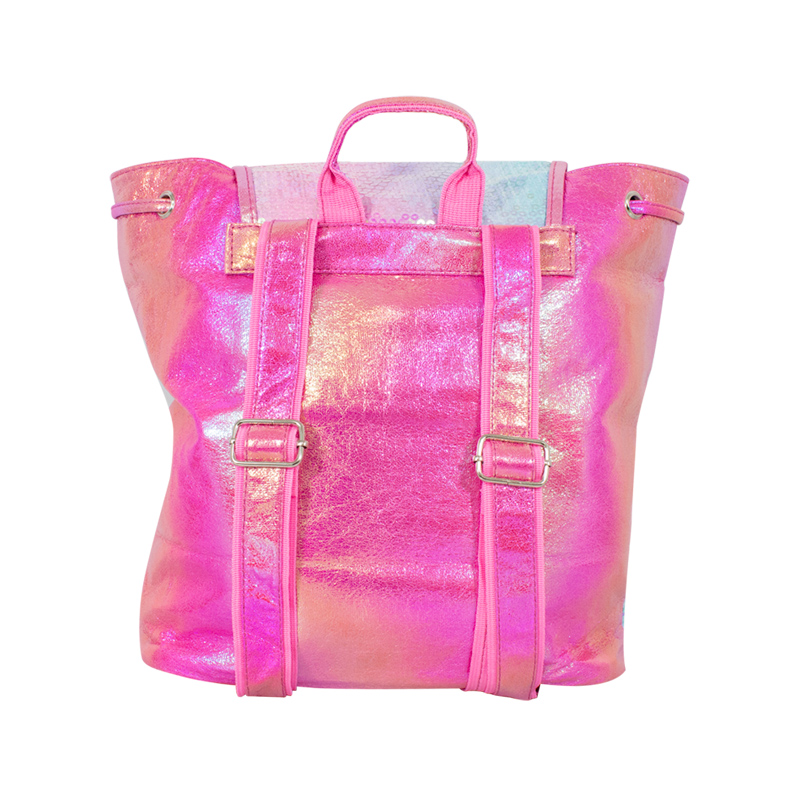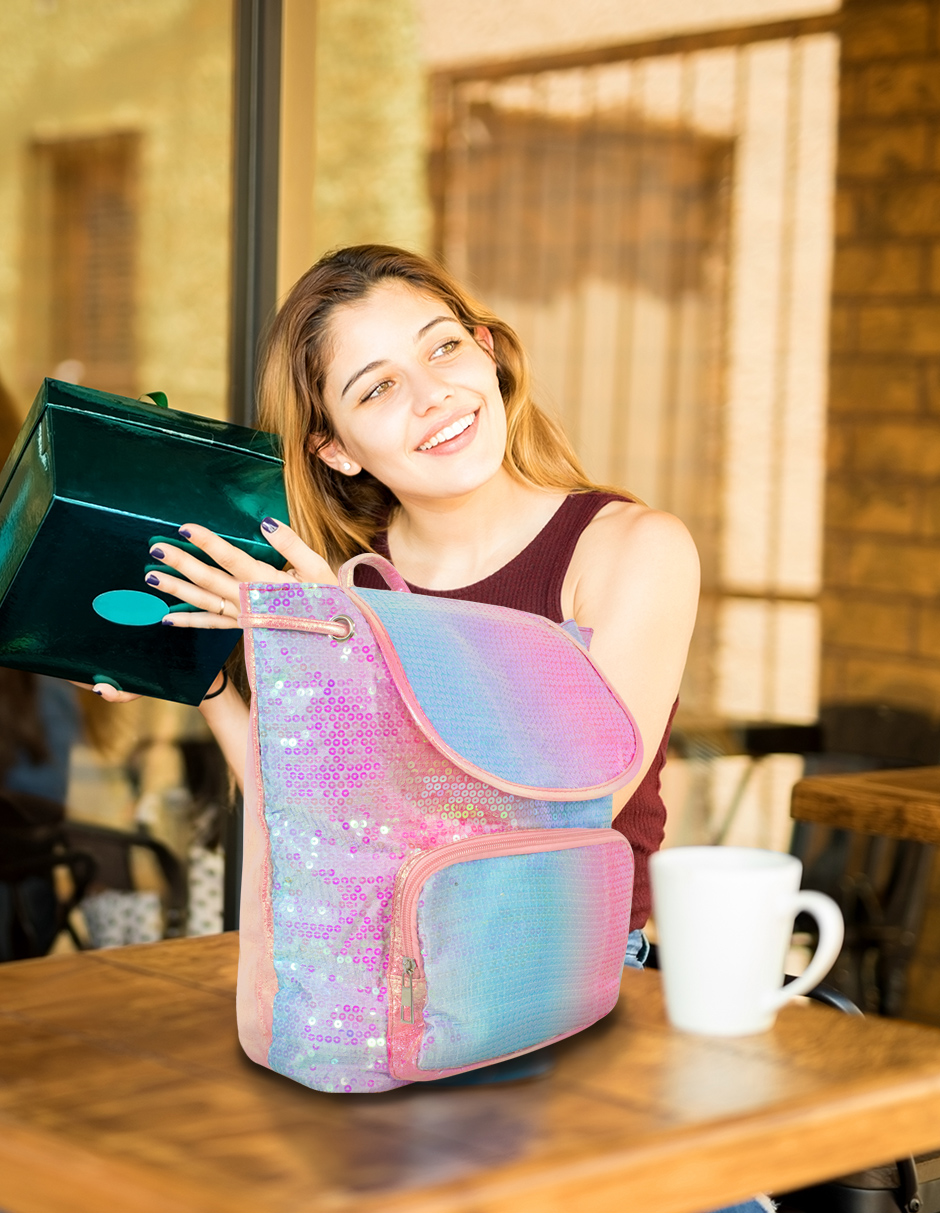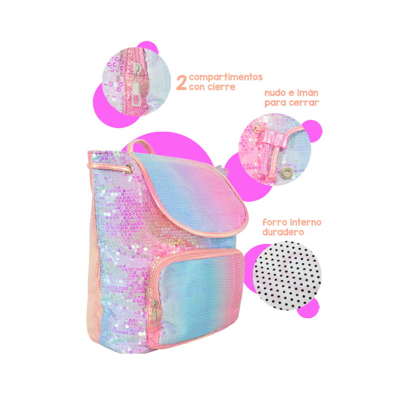 La estructura es de alta resistencia, confeccionada en lona de gran calidad, aportando gran durabilidad y resistencia aparte cuenta con un lindo color tornasol de colores. Se compone por un diseño de lentejuelas tornasol, Como detalle extra, cuenta con un compartimiento frontal. Los tirantes son ajustables. Presenta un tamaño de 27 cm, perfecto para que lleve en su compartimento todo tipo de artículos.