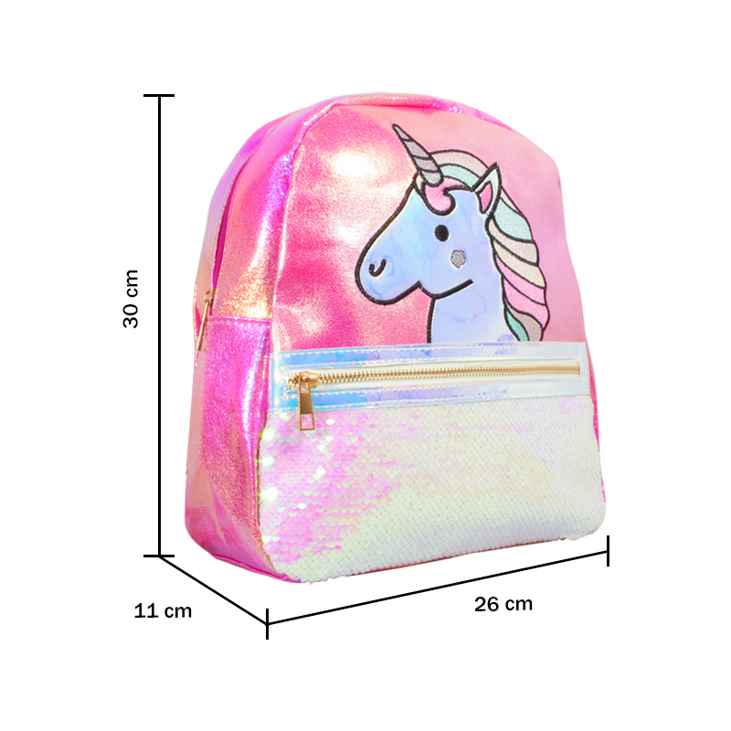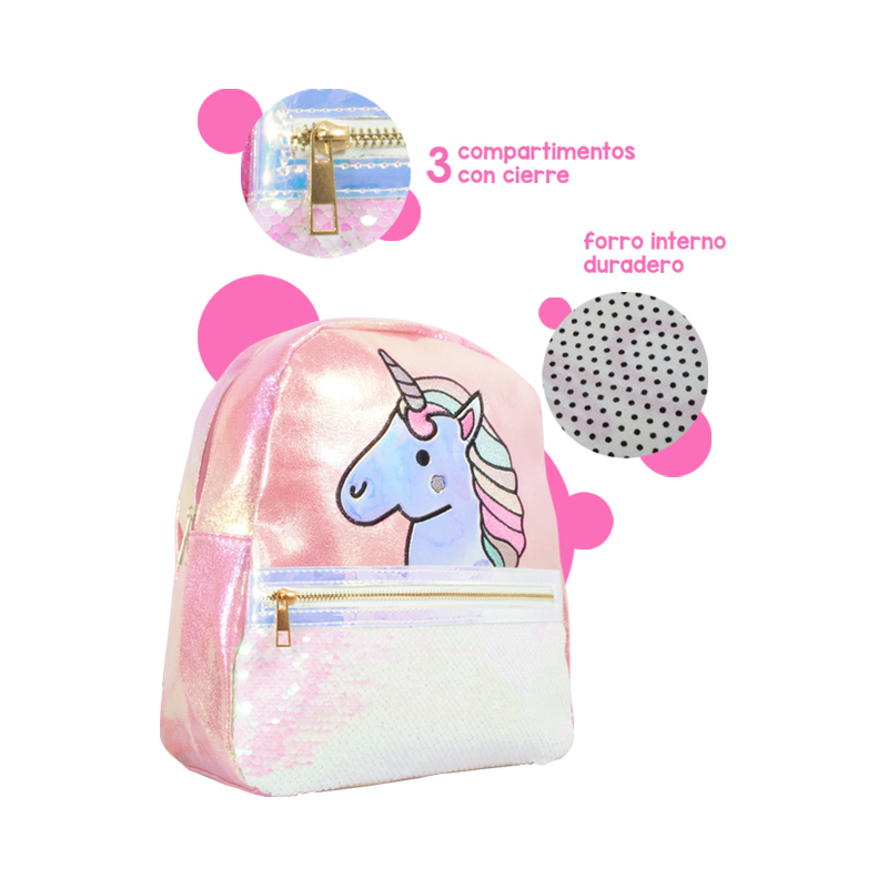 La estructura es de alta resistencia, confeccionada en lona de gran calidad, aportando gran durabilidad y resistencia aparte cuenta con un lindo color tornasol color rosa. Se compone por un diseño de un lindo unicornio. Como detalle cuenta con lentejuelas que se puede cambiar de color al pasar la mano por encima de la lentejuela. Tiene un compartimiento frontal. Es ideal para que resguarde sus artículos de forma segura y confortable tu pequeña. Los tirantes son ajustables. Presenta un tamaño de 30 cm, perfecto para que lleves en su compartimento todo tipo de artículos.