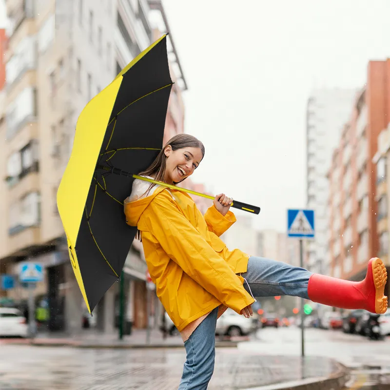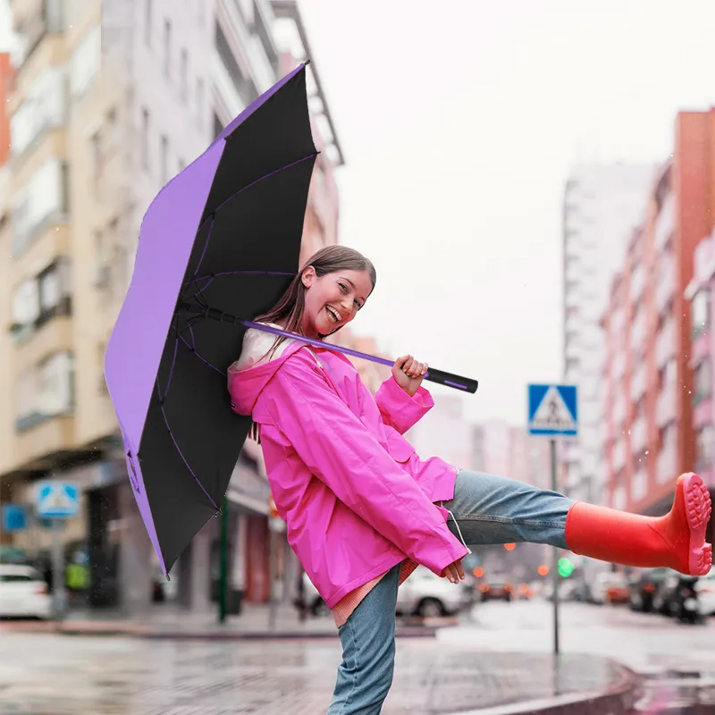 Increíble y amplio paraguas de color liso con varilla flexibles de policarbonato de color, será el ideal para llevar contigo por todos lados en la ciudad en esas épocas de lluvia.