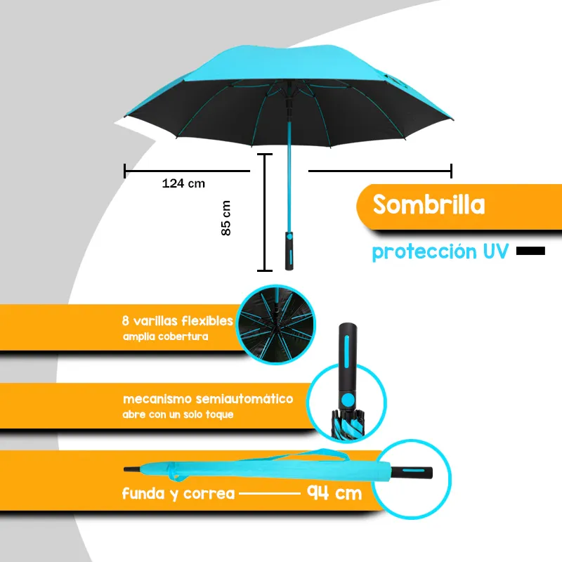 ADVERTENCIA: Los paraguas semiautomáticos abren con el botón. Sí usted intenta abrir manualmente, el paraguas se dañará y NO se aceptarán devoluciones por mal manejo de él.