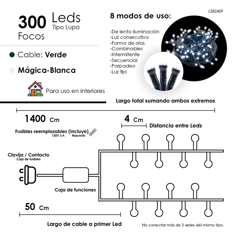 Ilumina tus celebraciones con la Serie Navideña de 300 Luces LED en un encantador tono blanco. Con un largo de 14 metros, esta serie de luces es perfecta para adornar tanto interiores como exteriores, creando un ambiente festivo y acogedor.