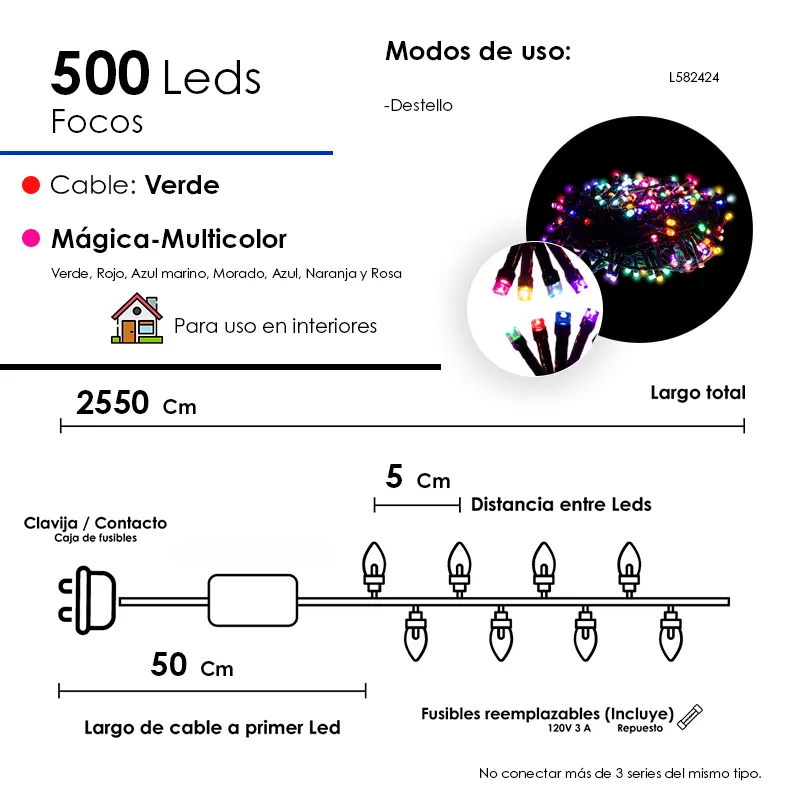Esta serie es el mejor detalle que puedes agregar a tu árbol y a cualquier lugar de tu hogar ya que lo hará lucir fantástico por su gran iluminación ya que cuenta con 500 focos led de luz multicolor, así que tienes 25 metros de iluminación para darle ese toque navideño a tu hogar, oficina o a dónde sea que quieras llevarla.