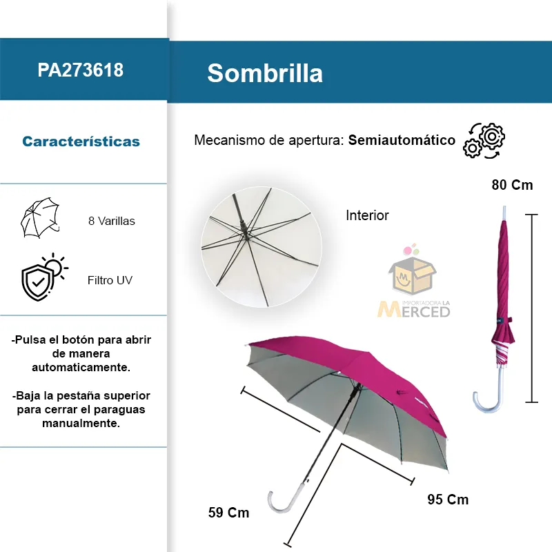 Prepárate para cualquier clima con esta elegante y funcional Sombrilla. Diseñado con un sistema semi-automático, se abre fácilmente con solo presionar un botón, brindándote protección inmediata ante la lluvia y Sol. Su estructura resistente y liviana lo hace ideal para llevarla siempre contigo.