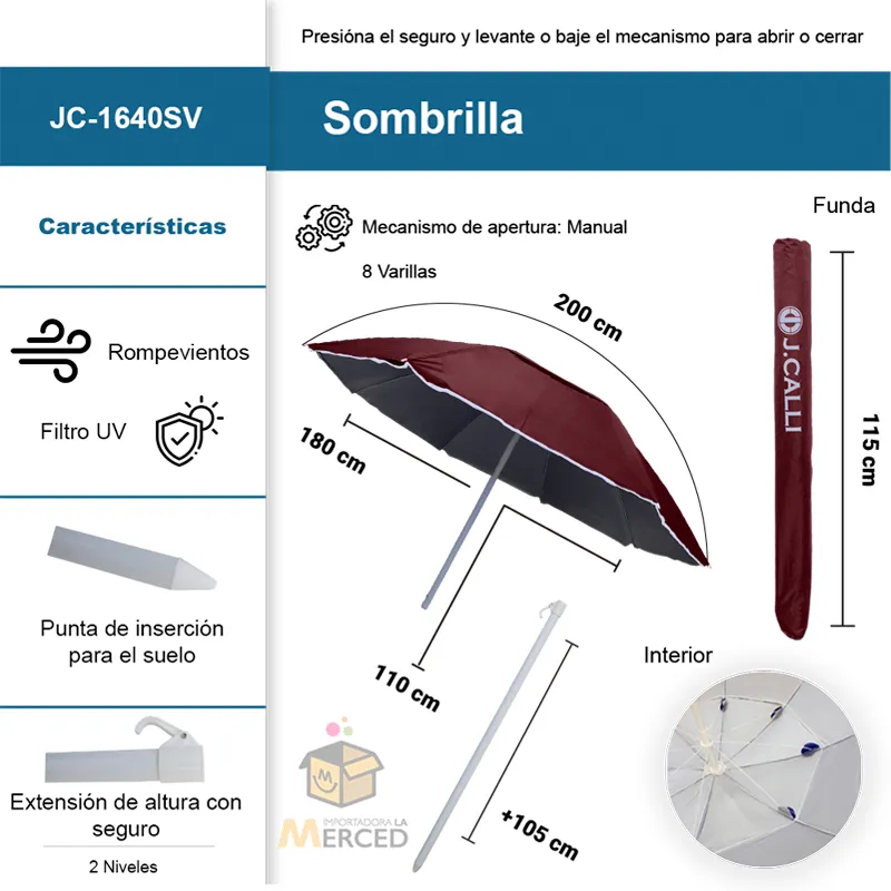Esta sombrilla cuenta con un tamaño de 2 metros de diámetro y esta reforzado por 8 varillas de policarbonato en la parte interna para darle un mayor refuerzo y como un detalle extra cuenta con su propia funda para un mayor cuidado.