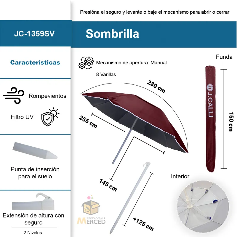 Esta sombrilla cuenta con un tamaño de 280 centímetros de diámetro y esta reforzado por 8 varillas de policarbonato en la parte interna para darle un mayor refuerzo y como un detalle extra cuenta con su propia funda para un mayor cuidado.